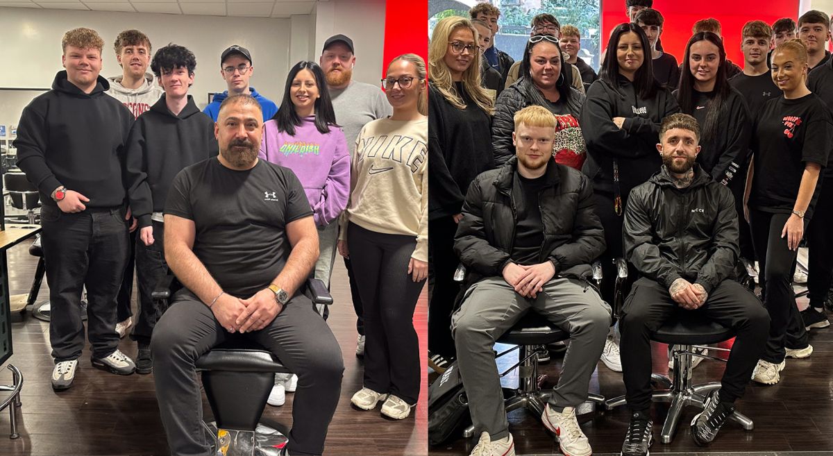 Level 3 Barbering alumni Charlie Smyth and Haz Omar visited the college in October to give students a better understanding of how to perform barbering and shaving techniques that are currently popular in the hair industry.