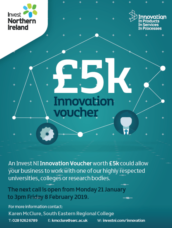 SERC are encouraging small and medium sized businesses to apply for an Invest NI Innovation Voucher to secure up to £5k worth of support to help their business innovate, develop and grow. The closing date for applicants is 3pm, Friday 8 February.