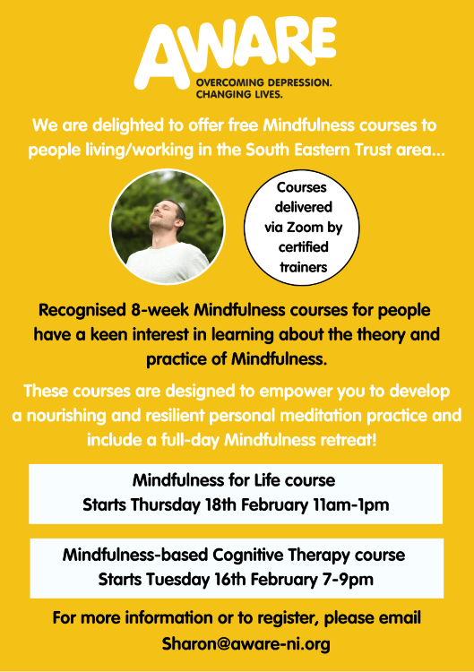 AWARE are offering free mindfulness courses for people living/ working in the South Eastern Trust area.