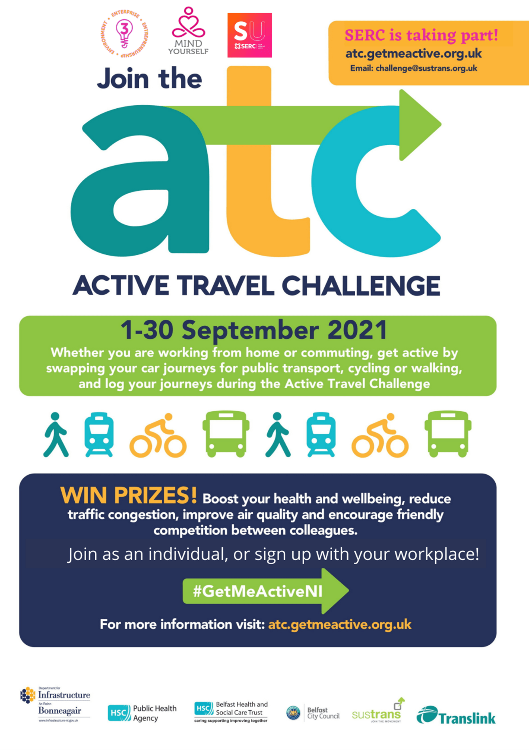 SERC are encouraging staff and students (over 18 years) to sign up to the Active Travel Challenge which is a joint initiative which has been championed by Translink, the Department for Infrastructure, Public Health Agency, Sustrans, Belfast Health and Social Care Trust, and Belfast City Council. It is part of a collaborative drive to inspire people to adopt greener travel options that will prioritise their health and wellbeing and support Northern Irelands ‘green’ economic recovery and progress towards a low-carbon future.