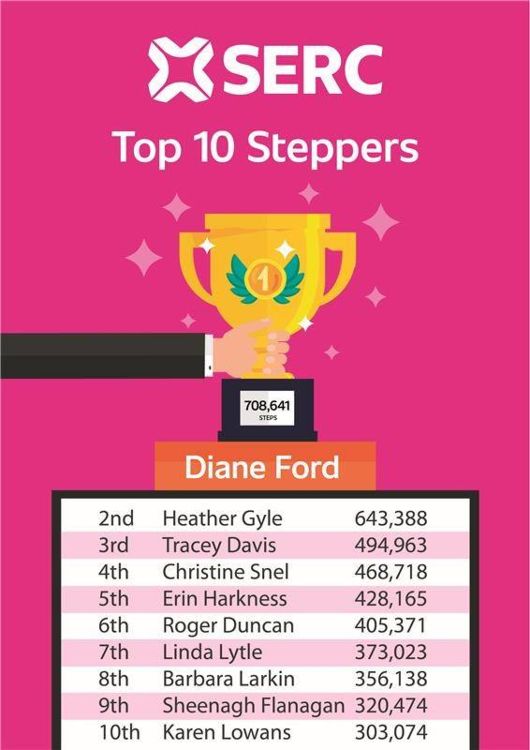 Well done to everyone who took part in the Step Challenge in April. The results are in and the winner of the step challenge was Diane Ford with a very impressive 708,641 steps.
