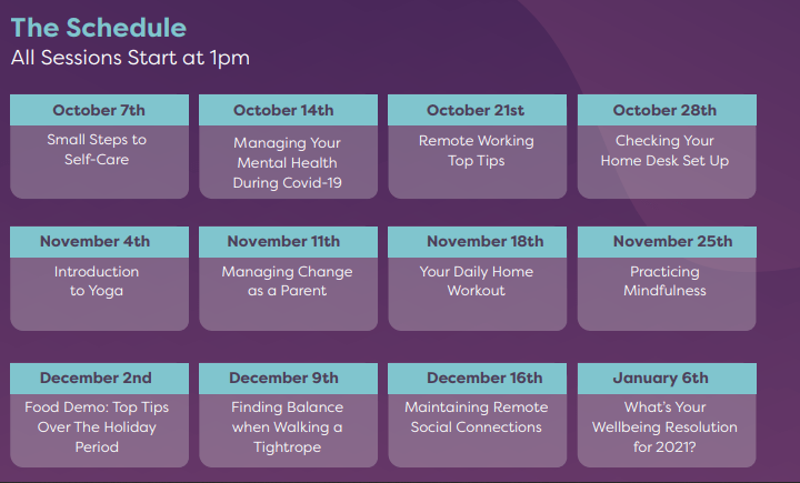 The sessions will run weekly from October 7th and will be delivered by a team of qualified health and wellbeing experts, and will be streamed live and will focus on a different aspect of health and wellbeing with topics ranging from Sleep, Mental Health, Fitness and Parenting etc. The sessions will start at 1.00 pm and will last approximately 45 minutes.