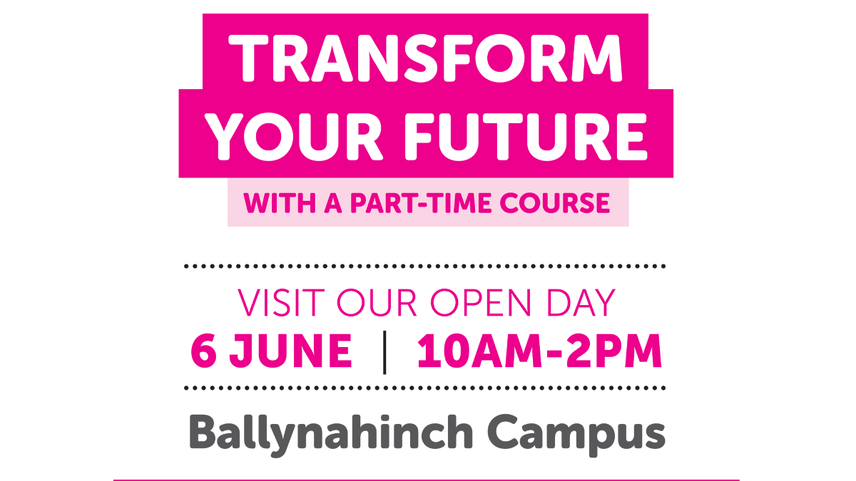 Come along to the Part-Time Open Day for our Ballynahinch Campus on Thursday 6th June from 10am-2pm.