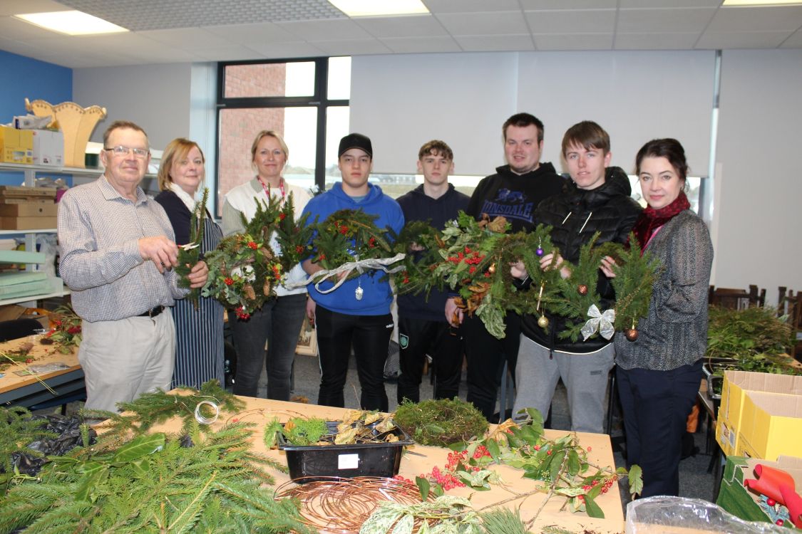 The Year 2 and 3 Skills for Life and Work students were led in the session by Mr Dermot Rooney (father of lecturer Catherine Rooney). Mr Rooney brought along all the greenery including fresh moss, fir, holly and ivy, and showed the students how to build up the wreaths. They were then adorned with festive baubles and bows.