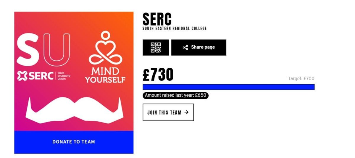 SERC’s Students’ Union in collaboration with Mind Yourself grew moustaches, walked, ran and cycled to raise funds for the charity with the team’s efforts raising a total of £730.