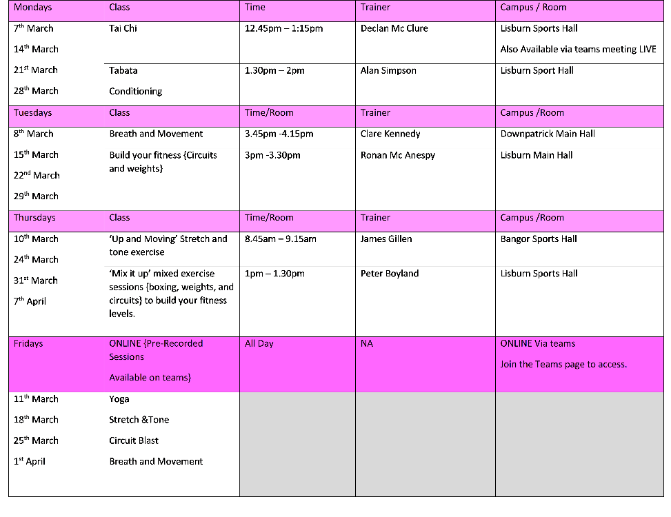 This is a four-week programme that will take place over 30min sessions. This is a great way to take some much-needed time out with others on campus, have fun, move more and feel better.