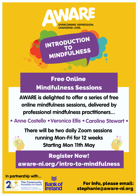 AWARE NI are launching a series of free online ‘Introduction to Mindfulness’ sessions for adults 18+ in partnership with the Community Foundation for Northern Ireland and Bank of Ireland.