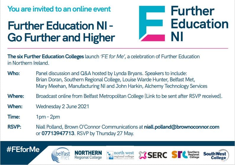 The six FE colleges in NI are launching the “FE for Me” campaign from 2 June 1pm-2pm, celebrating and highlighting the huge range opportunities offered by the Further Education sector. Colleges have a central role to play in delivering a skilled workforce to help rebuild the NI economy after the pandemic and are crucial in supporting learners to gain qualifications and experience valued by employers.