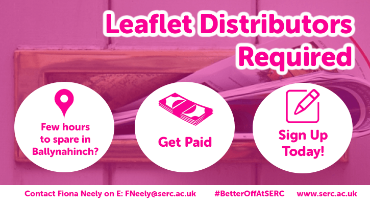 Leaflet Distributors required for Ballynahinch Area. This is a paid job with no previous experience necessary.