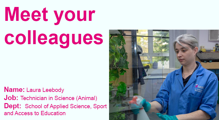 This week’s “Meet your Colleagues” features Laura Leebody. Laura currently works as an Technician in Science (Animal) from the School of Applied Science, Sport and Access to Education at SERC.