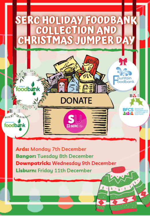 The Students' Union will be collecting donations for Newtownards Foodbank starting from 30 November. This will be crucial for many families who are struggling in the run up to Christmas.
