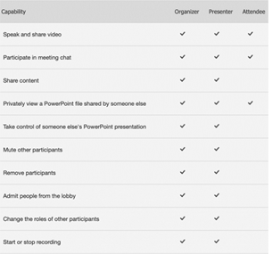 Presenters have full rights, while attendees are more controlled. To change roles, choose “Meeting options”, and create the settings. You can also do this within the meeting, by selecting the participants and their role.