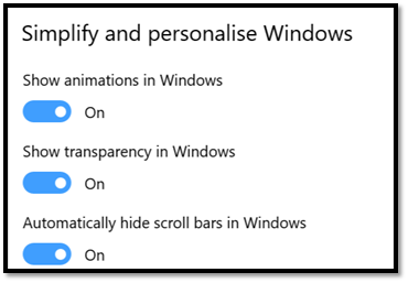 Select Start > Settings > Ease of Access > Display . Then, turn off the toggle under Show animations in Windows.