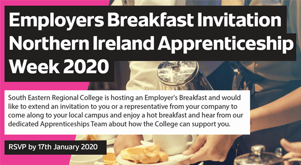To celebrate the first ever NI Apprenticeship Week 2020, South Eastern Regional College (SERC) is hosting an Employer’s Breakfast and would like to extend an invitation to you or a representative from your company to come along to your local main campus and enjoy a hot breakfast and hear from our dedicated Apprenticeships Team about how the College can support you.