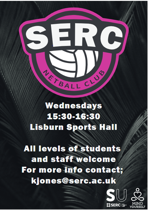 All levels of students and staff are welcome to the new SERC Netball Club, taking place on Wednesdays from 15:30 to 16:30 in the SERC Lisburn Campus Sports Hall.