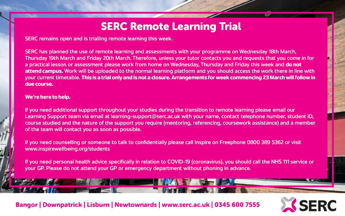 For the remainder of the week (Wednesday 18 Thursday 19 and Friday 20) SERC has planned the use of remote learning and assessments. Unless your tutor contacts you and requests that you come in for a practical lesson or assessment please work from home.