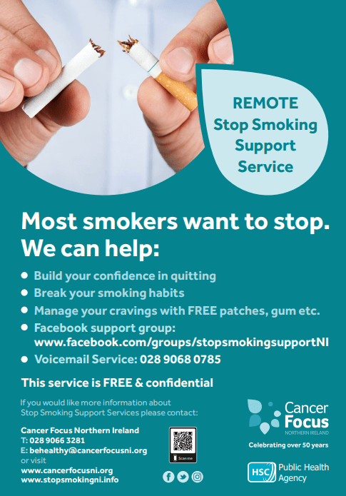For more information on the Cancer Focus Stop Smoking Support Service click the link here: Stop Smoking Service - Cancer Prevention - Cancer Focus NI