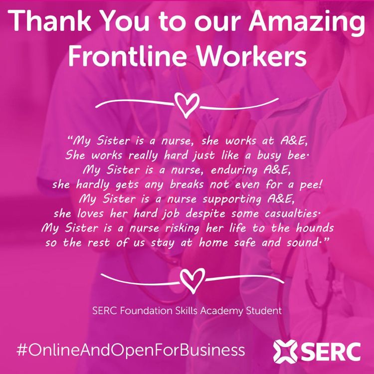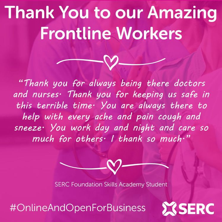 Foundation Skills Academy students from all four of SERC's main campuses, Downpatrick, Bangor, Lisburn and Newtownards wanted to express their gratitude and admiration for the frontline workers that are helping to fight Covid-19.