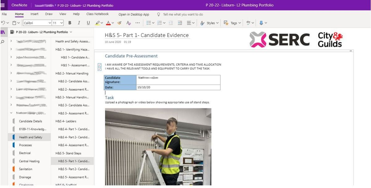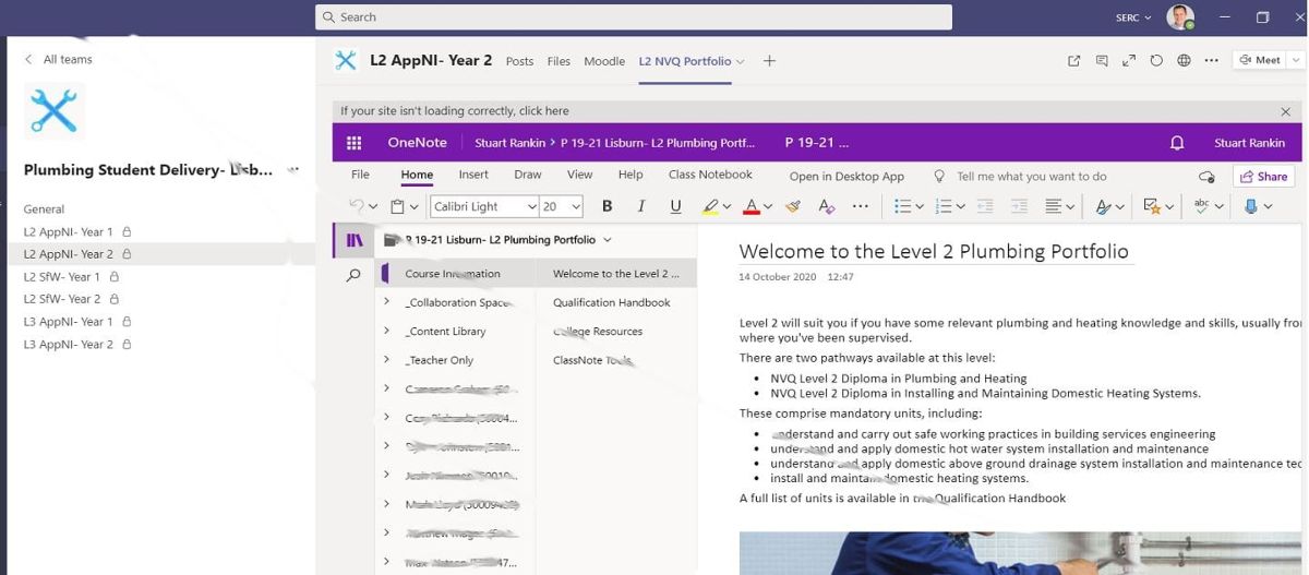 Here we see a Digital portfolio developed in classnote. The digital portfolio tracks the knowledge/ practical and NVQ provision for each learner. There are tools such as “dictation”, “recording”, embedding videos/ images, that help the learners gather evidence in a more dynamic way. The portfolio is embedded into their individual MS Teams channels for access. It is also available through the OneNote App on any tablet or mobile device.