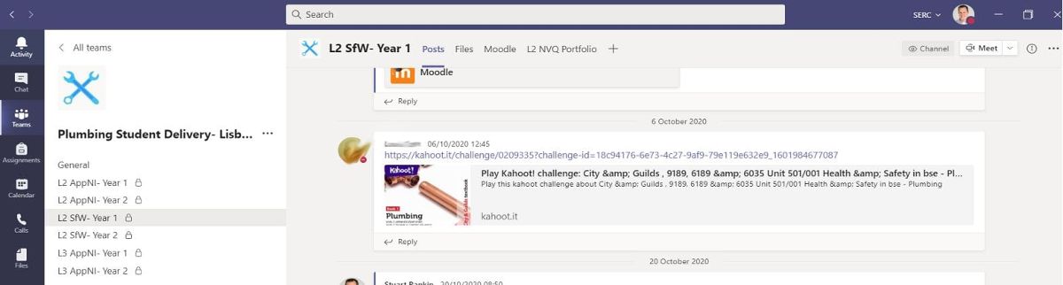 This is the typical set up for the lecturers in Building Services in Microsoft Teams. Each cohort has a private channel for staff/ students to communicate through. The private channel has direct links to many resources, keeping everything in one place. This allows students free flowing and easy access to whatever resources they need, including their e-portfolio.
