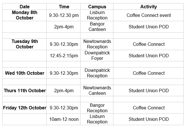 The Student Union will be launching their new POD for students with information on Mental Health and Wellbeing and they will be offering a range of wellbeing activities.