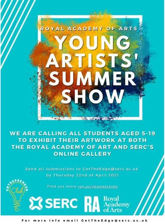We are also pleased to announce that SERC are going to produce their own online art gallery to proudly display all submissions received. The SERC gallery will be open to ALL staff and students (no age restrictions apply). So, if you are not eligible for the RA exhibition, we would love to display your work in our gallery. When submitting your work please include whether it is for Royal Academy, SERC or both.