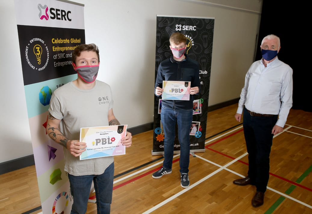 Pic 2: ‘Navigator’ Joint Runners Up in SERC’s Enterprise Expo Showcase 2020: HND Computing students who have created an app in order to make it easier for students and staff to navigate 3round SERC to help ensure they are following new systems and safety measures put in place in light of the pandemic. (L-R): Conor Smith (Belfast), Aaron Millar (Lisburn) and Terence Brannigan, SERC, Entrepreneur in Residence.