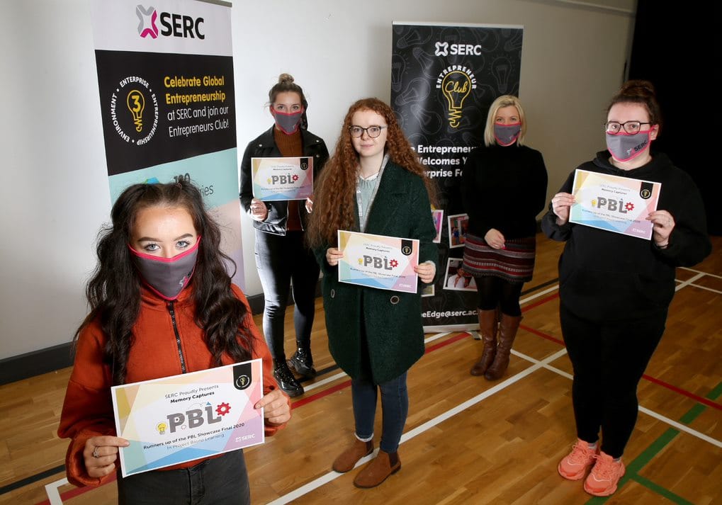 Pic 3: ‘Memory Captures’ Joint Runners Up in SERC’s Enterprise Expo Showcase 2020: A group of Level 3 Diploma in Health and Social Care students from SERC Newtownards campus who have created a memory journal to aid stimulating the memories of a person with a memory loss condition including dementia. They are also looking to bring to market a QR code bracelet for dementia suffers to keep them safe (L-R): Louise Savage (Holywood), Georgia Keddie (Newtownards), Anna Kirkwood (Dundonald), Michelle Rooney, SERC’s School of Health, Early Years and Adult Education and Sarah Waters (Conlig).
